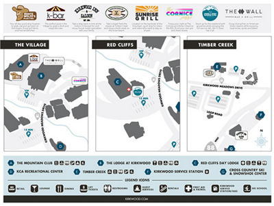 Think of Kirkwood as a big horseshoe. And in the middle of the horseshoe is the Kirkwood Village. Where you will find restaurants, Ski and Ride School, Expedition: Kirkwood, Kirkwood Mountain Sports and our Chairlifts that take you to the top of the mountain.